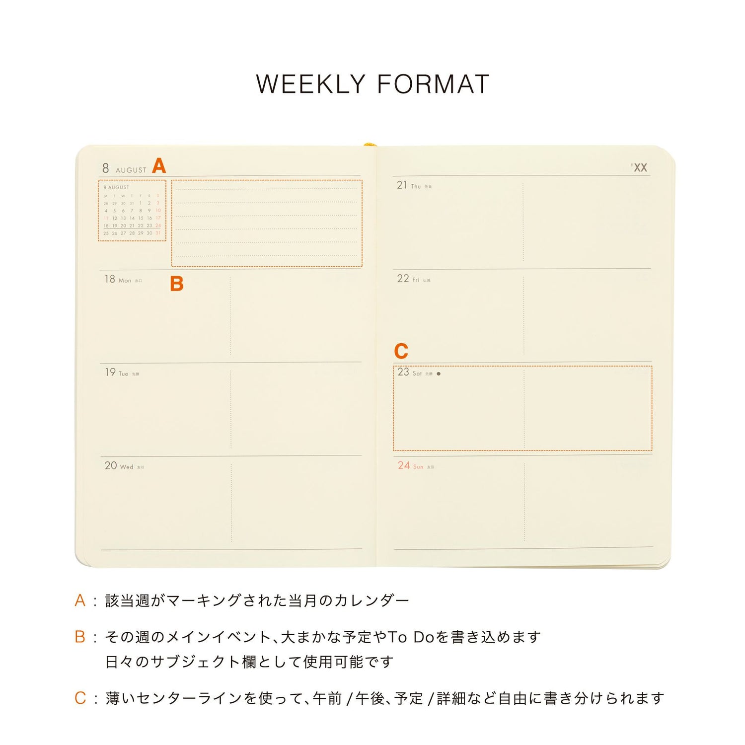Yearly calendar, monthly schedule, weekly schedule, notes, and personal data sheet - Soft cover + Pen Holder + Bookmarks + Corner pocket